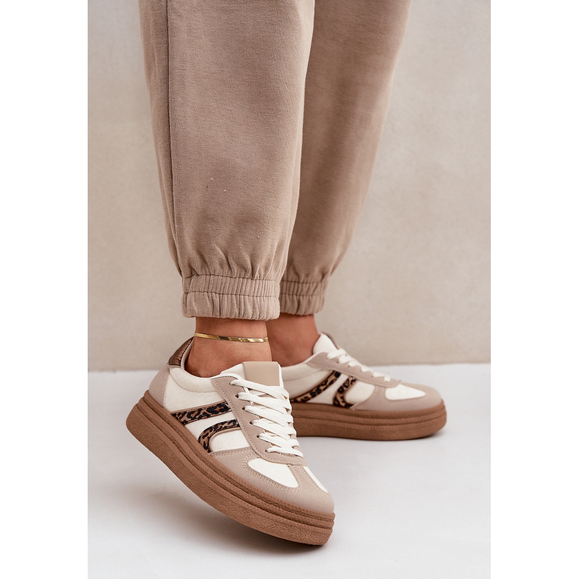 Le scarpe da ginnastica sono disponibili in un bellissimo colore beige con dettagli marroni, che li rende perfettamente armonizzati con molti colori e disegni di vestiti, tra cui una tendenza degli animali, che sta attualmente tornando alla moda. Il modello viene creato nella numerazione tipica, il che rende più facile scegliere la giusta dimensione.