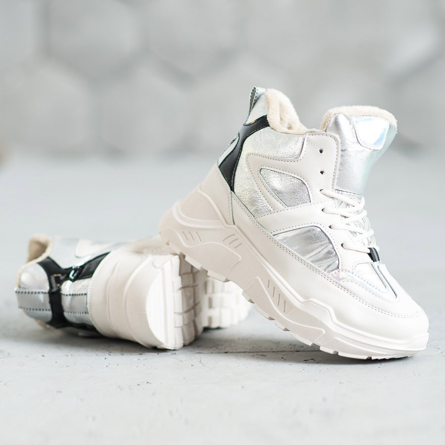 Scopri una nuova dimensione di stile con i nostri stivaletti sportivi alla moda in bianco e grigio! Questi stivali unici sono un must assoluto per ogni donna alla moda che vuole unire comfort ed eleganza. Grazie agli inserti metallici in argento e nero, puoi facilmente completare il tuo stile quotidiano, conferendogli un carattere moderno.