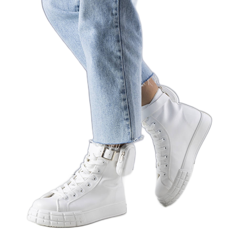 Sneaker alla caviglia bianca con una bustina Willie - devono avere nel tuo guardaroba. Il taglio classico e alto con una sola finitura alla moda rende questo modello combina perfettamente il comfort con lo stile urbano. Una bustina pratica e piccola fissata con una fibbia: perfetta per le chiavi, la piccola o la carta è attaccata alla coppia. La parte superiore in pelle ecologica garantisce un aspetto elegante senza compromessi per comodità.