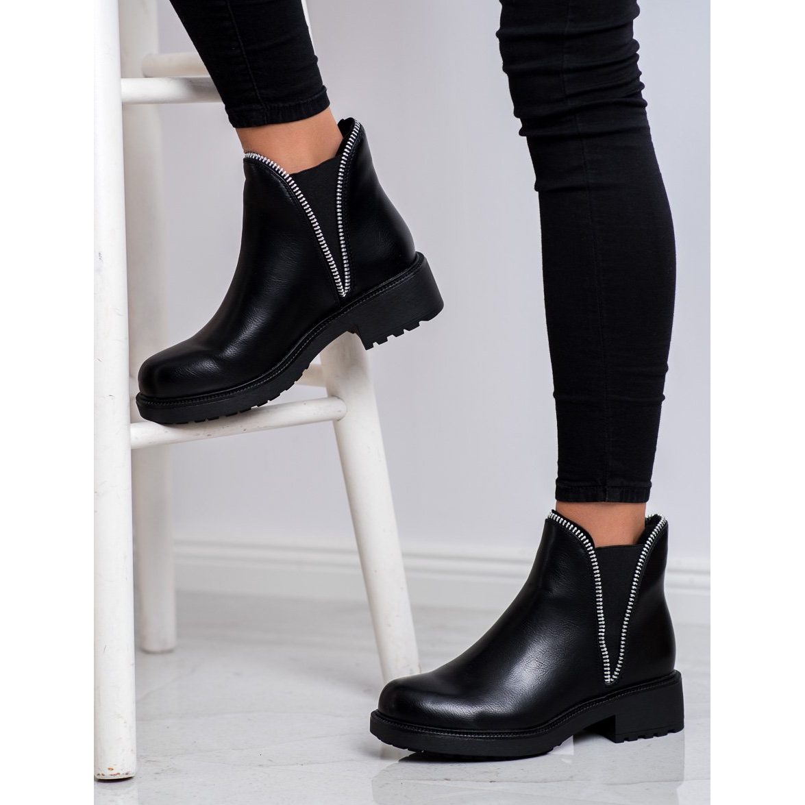 Gli stivaletti Chelsea sono caratterizzati da una punta rotonda, che conferisce loro un carattere classico, e un tacco piatto alto 4 cm li rende comodi da indossare per lunghi periodi. Il contrafforte del tallone è integrato e irrigidito, il che influisce ulteriormente sul comfort e sulla stabilità del piede. L'altezza superiore di 12-13 cm garantisce una vestibilità perfetta, mentre la larghezza superiore di 20 cm consente di indossarla facilmente grazie all'innovativa chiusura slip-on.