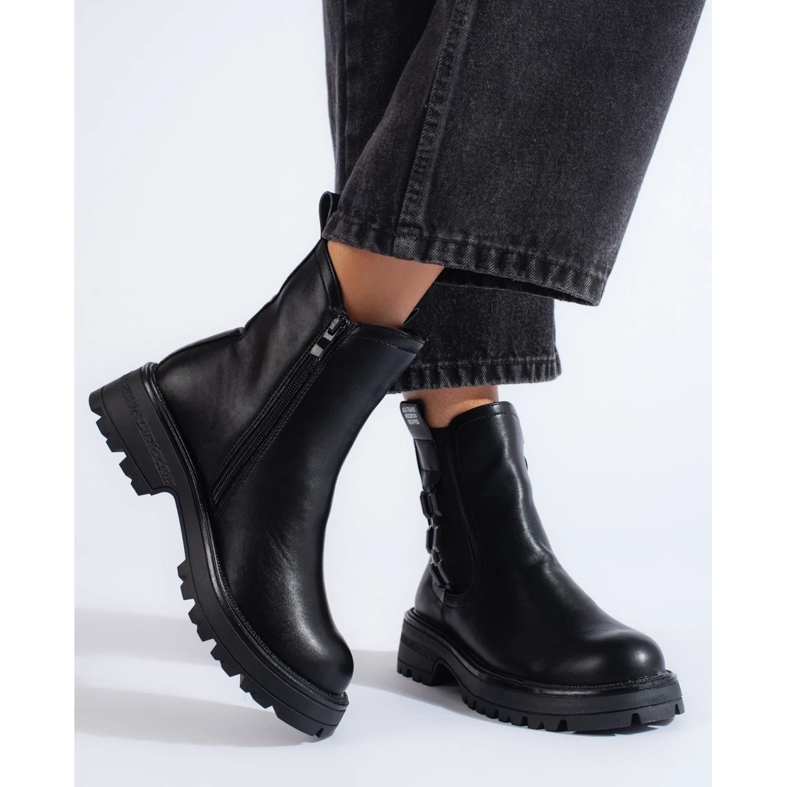 Black Women's Chelsea Boots su una suola nera - un classico in un'edizione moderna. Universale, isolato, perfetto per l'autunno e l'inverno; Combinano un personaggio casual con un accento della moda, lavoreranno sia su base giornaliera che per una serata fuori.