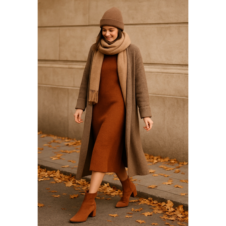 I vestiti in maglia autunnali sono un altro capo di abbigliamento che sembra fenomenale con gli stivaletti a punta quadrata. Scegli un modello più ampio in una tonalità di marrone zenzero o senape. Indossa collant spessi color carne o una tonalità che si abbina al vestito. Aggiungi stivaletti piatti o con tacco basso. Completa il look con un cardigan lungo e un cappello in tinta. Questo outfit non è solo comodo, ma anche estremamente stiloso e in linea con le tendenze autunnali.