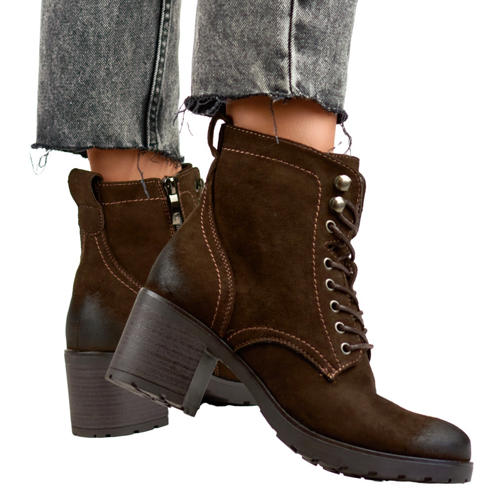 Eleganti stivali da donna in pelle scamosciata - stile e comfort per giorni più freddi. Il colore marrone e il naso classico e rotondo fanno sì che le scarpe si adattassero perfettamente alle stilizzazioni sia quotidiane che più eleganti. L'altezza della tomaia alla caviglia (circa 13 cm) e un post alto 6 cm aggiungono un'eleganza sottile alla silhouette senza rinunciare al comfort.
