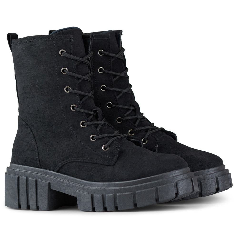 Lavoratori eleganti e pratici realizzati in pelle scamosciata ecologica in nero senza tempo. Perfetto per la stagione autunno/inverno - isolata, su una piattaforma stabile 5 cm, offrono comfort e aspetto alla moda ogni giorno.