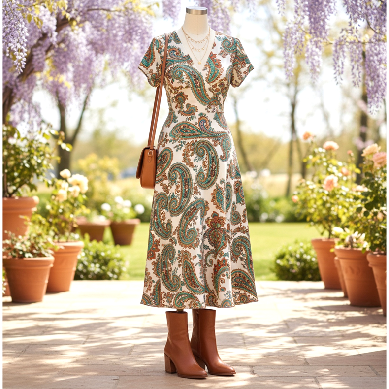 Un abito midi in viscosa o seta con stampa paisley o floreale abbinato a stivaletti marroni con tacco alto è il look perfetto per un matrimonio primaverile o il compleanno di una persona cara. Aggiungi una borsa a tracolla in pelle marrone chiaro e una collana delicata: l'effetto è pronto.