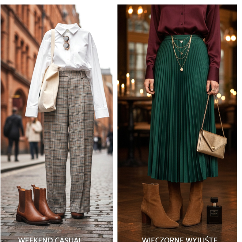 Weekend casuale: Pantaloni larghi a quadretti (i cosiddetti pantaloni a quadri) abbinati ad una maglietta bianca o ad una semplice camicia oxford e stivaletti Chelsea marroni: questo è un look ispirato alle strade alla moda di Londra, che funziona ugualmente bene per lo shopping del fine settimana o per un bar con gli amici. Una borsa lunga in pelle o una borsa in tela sono l'accessorio perfetto.