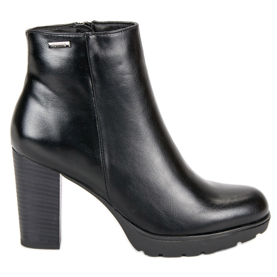 Grazie al tacco a forma di montante, alto 9 cm, si ottiene allungamento ottico della silhouette e stabilità. Gli stivaletti neri si sposano perfettamente con una varietà di stili - sia con pantaloni, vestiti e gonne, il che li rende un elemento versatile di ogni guardaroba.