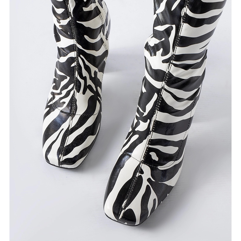 Stivali alpri eleganti con un motivo alla moda che imita la pelle zebra. Raggiungono la caviglia, hanno una serratura pratica che facilita lo stabilimento e un posto stabile con un'altezza di 8,5 cm. Perfetto per l'autunno -inverno stagione per le persone che apprezzano la combinazione di un design audace con il comfort.