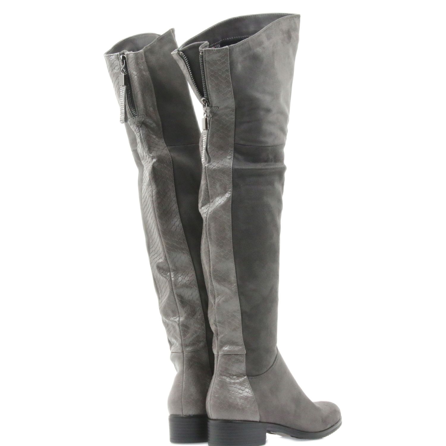Gli stivali sopra il ginocchio Filippo 379 in grigio sono la scelta perfetta per le donne che apprezzano lo stile e il comfort. Realizzati in ecopelle scamosciata di alta qualità, questi stivali hanno un aspetto elegante e funzionale allo stesso tempo. Il retro della tomaia è decorato con un esclusivo inserto sintetico che imita una scaglia di serpente, aggiungendo carattere alla calzatura.