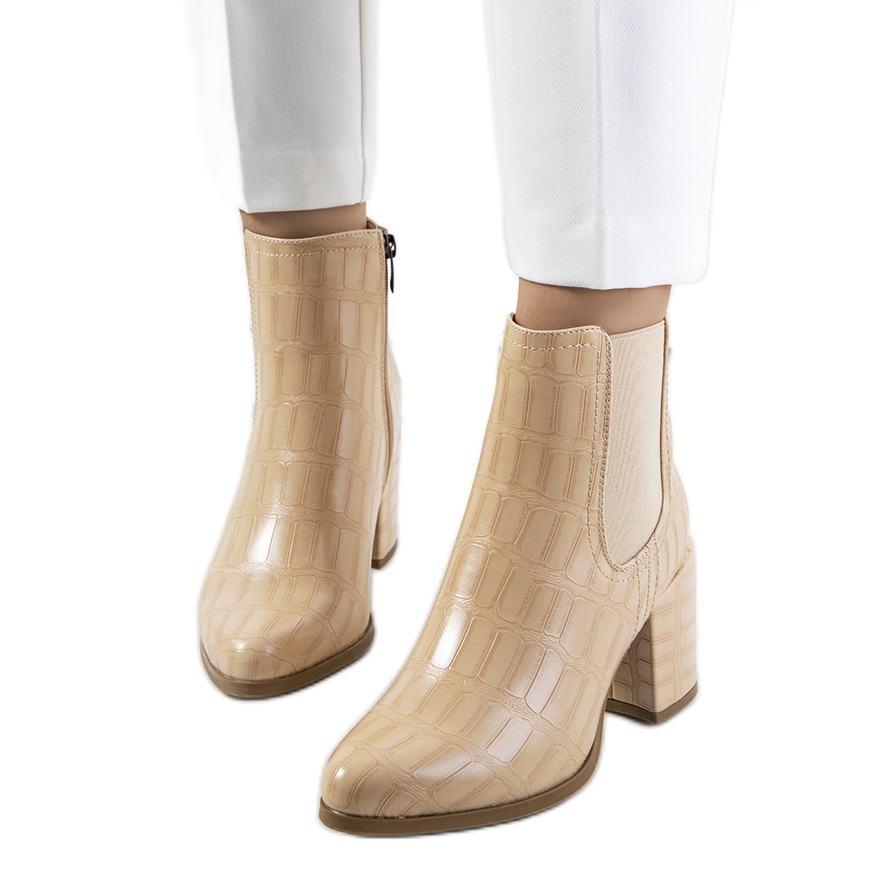 Stivali classici di Easthaven in beige in pelle ecologica. Un modello con un naso sottile e appuntito, incorporato su un palo stabile (7 cm), leggermente isolato dall'interno - la scelta perfetta per le stilizzazioni autunnali e invernali. Una chiusura della cerniera dall'interno garantisce un comodo indossare e la pressatura della pelle del coccodrillo che imita la pelle aggiunge un carattere elegante alle scarpe.