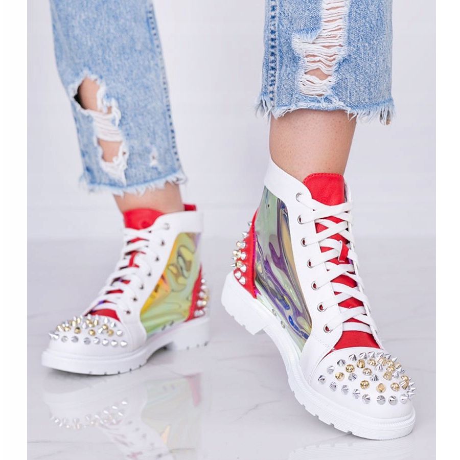 Scopri gli stivali Lea unici che deliziano non solo con il loro aspetto, ma anche con il comfort! Queste sneakers bianche e rosse sono la scelta perfetta per le donne che vogliono aggiungere un tocco in più al proprio stile. Realizzate in pelle ecologica, hanno un aspetto fenomenale grazie alla tomaia parzialmente trasparente in colore olografico.