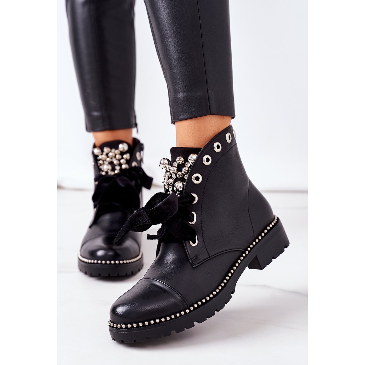 Il modello è caratterizzato da un taglio originale della tomaia e da decorazioni uniche. Perle di metallo, strass e nastri conferiscono alle scarpe un fascino unico, quindi attireranno sicuramente l'attenzione degli altri. Gli stivali sono disponibili nel classico colore nero, che li rende un'aggiunta universale a molti stili.