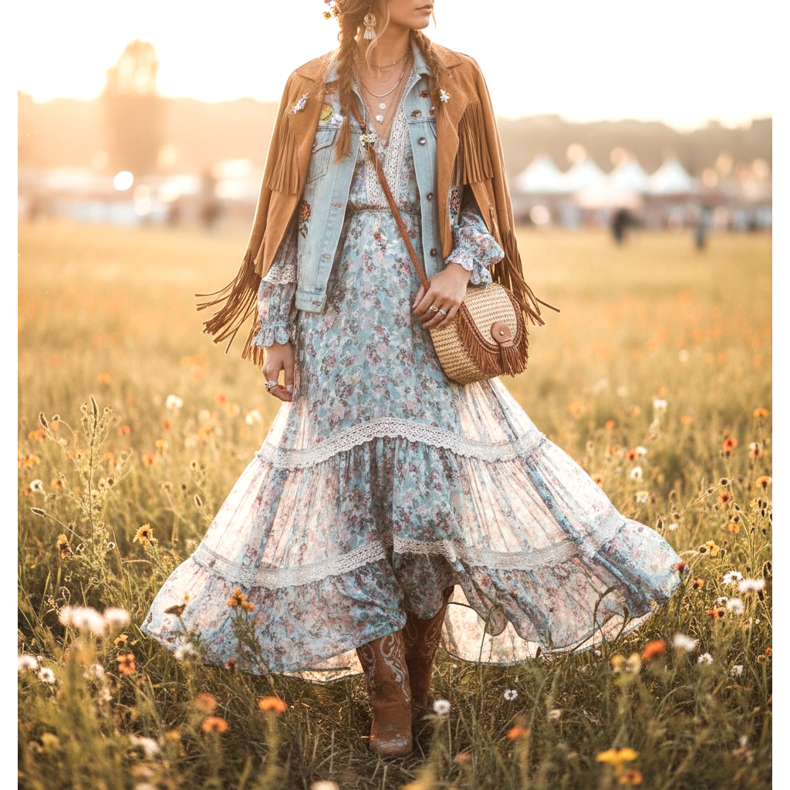Il miglior compagno per gli stivali da cowboy è un abito arioso in stile boho. Scegli un modello con fiori, volant o pizzo. Il contrasto tra la scarpa in pelle pesante e il materiale delicato dell'abito crea un effetto estremamente elegante. Aggiungi una giacca scamosciata con frange o una katana in denim e sei pronta per un festival o un appuntamento.