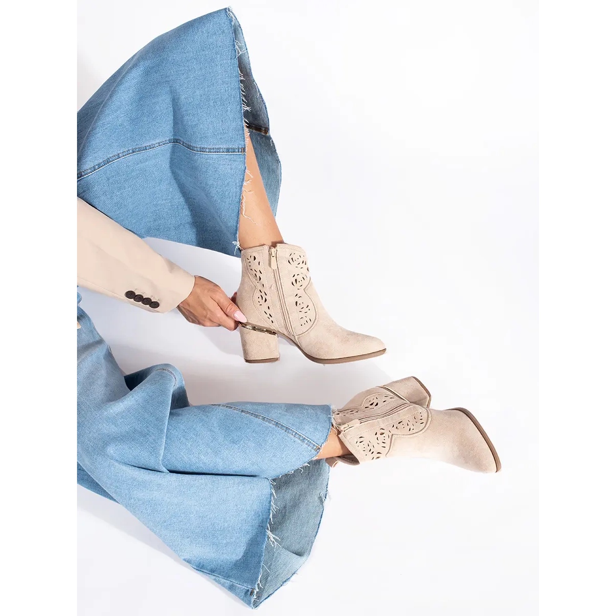 Realizzati in pelle scamosciata ecologica di alta qualità, stivali da cowboy si divertono con il loro aspetto estetico e una finitura aperta che dà loro leggerezza. Il colore di Beige va perfettamente con varie stilizzazioni, sia casuali che più eleganti. L'altezza della tomaia è di 11 cm e la larghezza 26 cm, il che garantisce la giusta adattamento alla gamba.