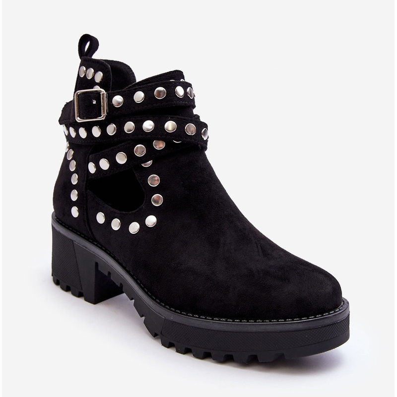 Elegante, confortevole e con un artiglio - Bella Boots è una proposta per le donne che cercano una forma classica con un accento alla moda. Realizzato in eco-sham, decorato con borchie e strass, incorporati su un blocco stabile con una piattaforma sottile. Scivolata, con una cintura fissata con una fibbia e ritagli alla moda sui lati - perfetti su base giornaliera e per ulteriori stilizzazioni di roccia.