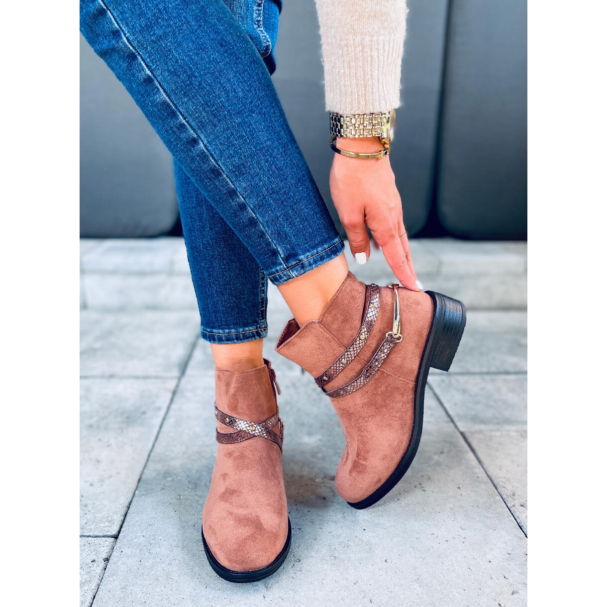 Presentiamo gli stivaletti in pelle scamosciata da donna Zinaida Camel, che deliziano con il loro design alla moda e un comfort eccezionale. Questi stivali bassi marroni sono la scelta perfetta per tutti i giorni, unendo eleganza e praticità. La tomaia, che avvolge delicatamente la caviglia, è decorata con strisce con motivo a pelle di serpente, che conferisce loro un carattere unico.