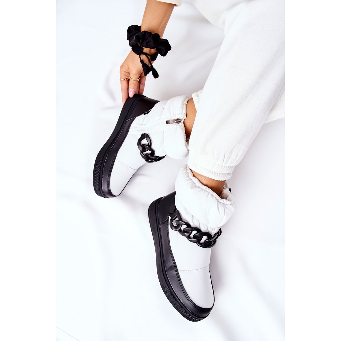 Gli scarponi da neve S.Barski hanno la tomaia alta, alta 15 cm, che protegge ulteriormente le caviglie dal freddo. Il loro elegante colore bianco si sposa perfettamente con molti stili invernali e gli strass conferiscono loro un carattere moderno.
