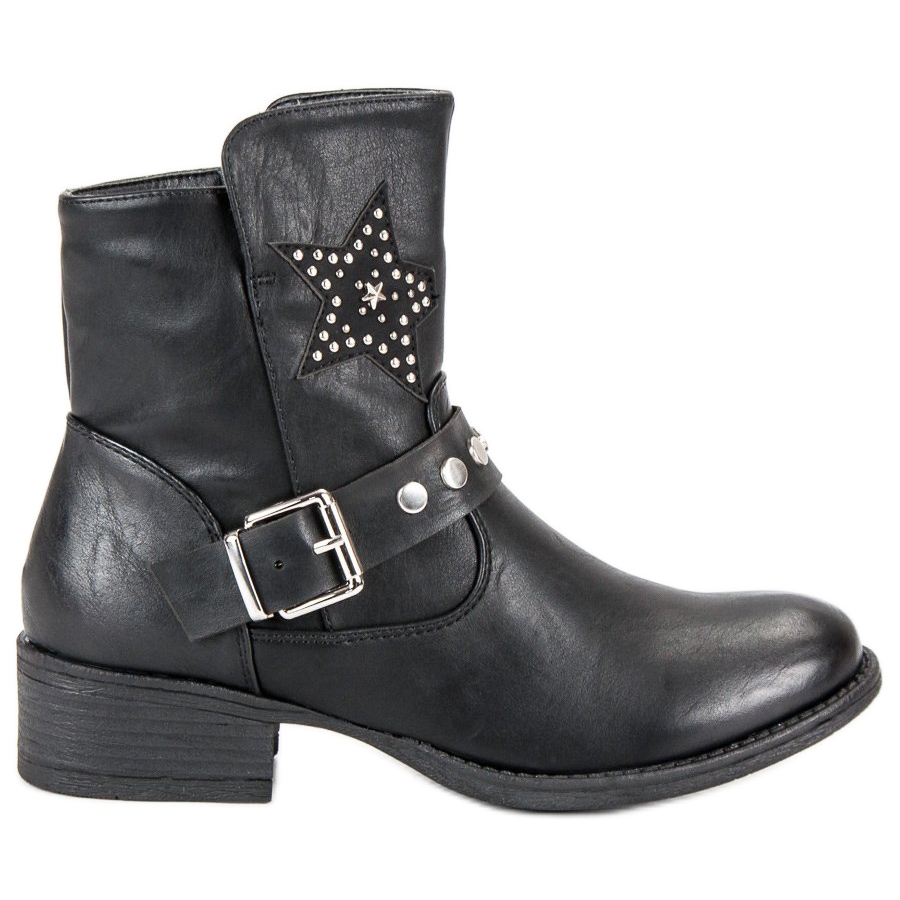 Scopri il tuo lato rock con i nostri esclusivi stivaletti neri, che diventeranno un elemento insostituibile del tuo guardaroba. Lo stile di queste scarpe è accattivante: un'elegante fibbia decorativa e una sottile stella fatta di perline conferiscono loro un carattere unico. Questi stivali si abbinano perfettamente agli stili rock, ma si adattano anche agli outfit casual di tutti i giorni.