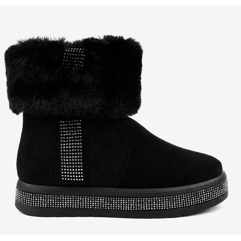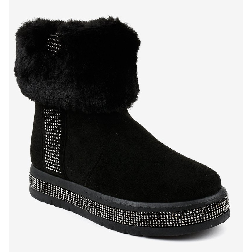 La tomaia delle scarpe arriva sopra la caviglia, garantendo un'ulteriore protezione dal freddo. L'interno isolante garantisce calore e l'accogliente rivestimento in pelliccia aggiunge fascino. Gli elementi chiave sono gli strass decorativi e gli strass, che aggiungono un tocco di brillantezza e originalità ad ogni styling.