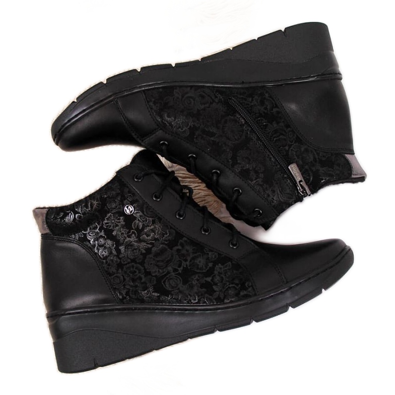 Scopri gli esclusivi stivali con zeppa in pelle isolante Helios W H537 nel classico colore nero, che sono diventati un must nel guardaroba di ogni donna. Queste scarpe estremamente comode del rinomato produttore polacco Helios ti offriranno non solo un look elegante, ma anche un comfort senza eguali.