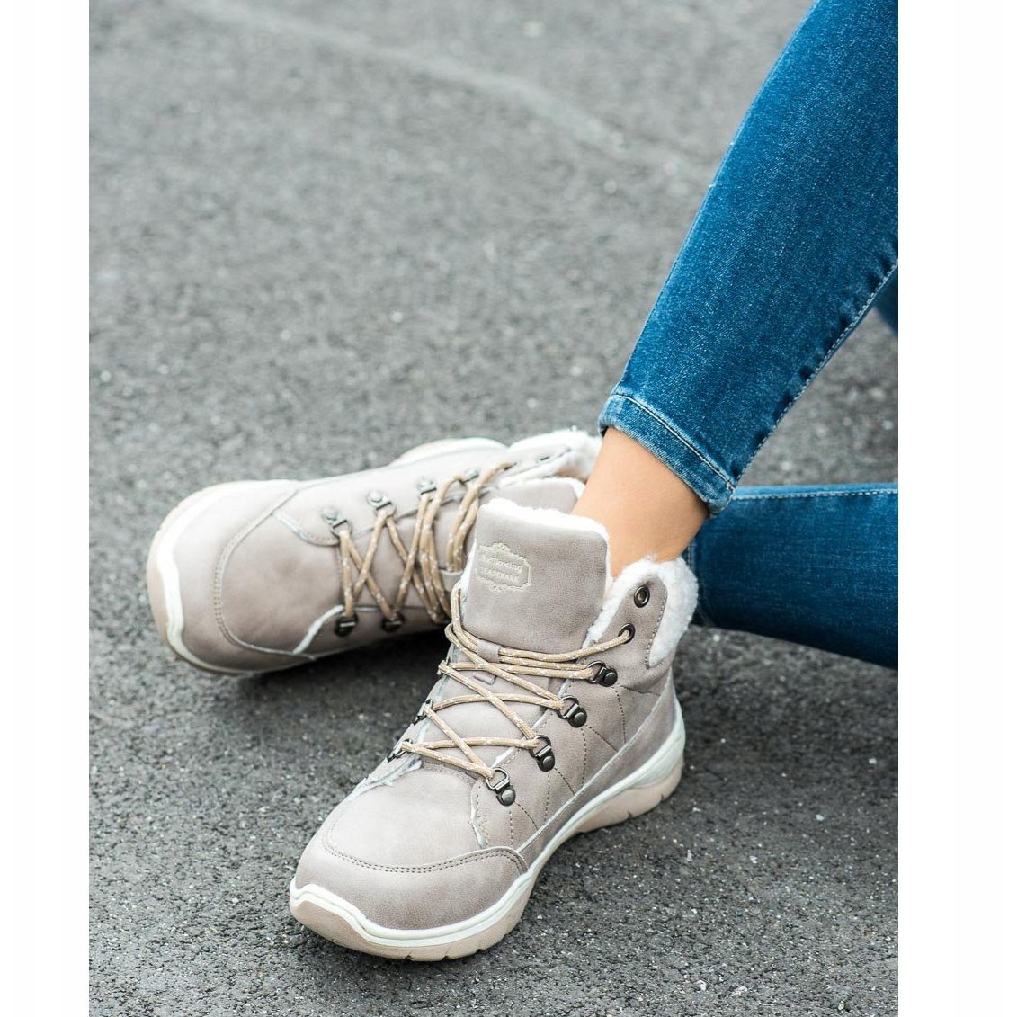 La parte esterna delle scarpe è realizzata in pelle scamosciata ecologica in una delicata tonalità grigio chiaro, che le rende eleganti e alla moda. Le cuciture decorative e l'allacciatura sulla parte posteriore del piede aggiungono carattere e garantiscono una perfetta aderenza al piede.