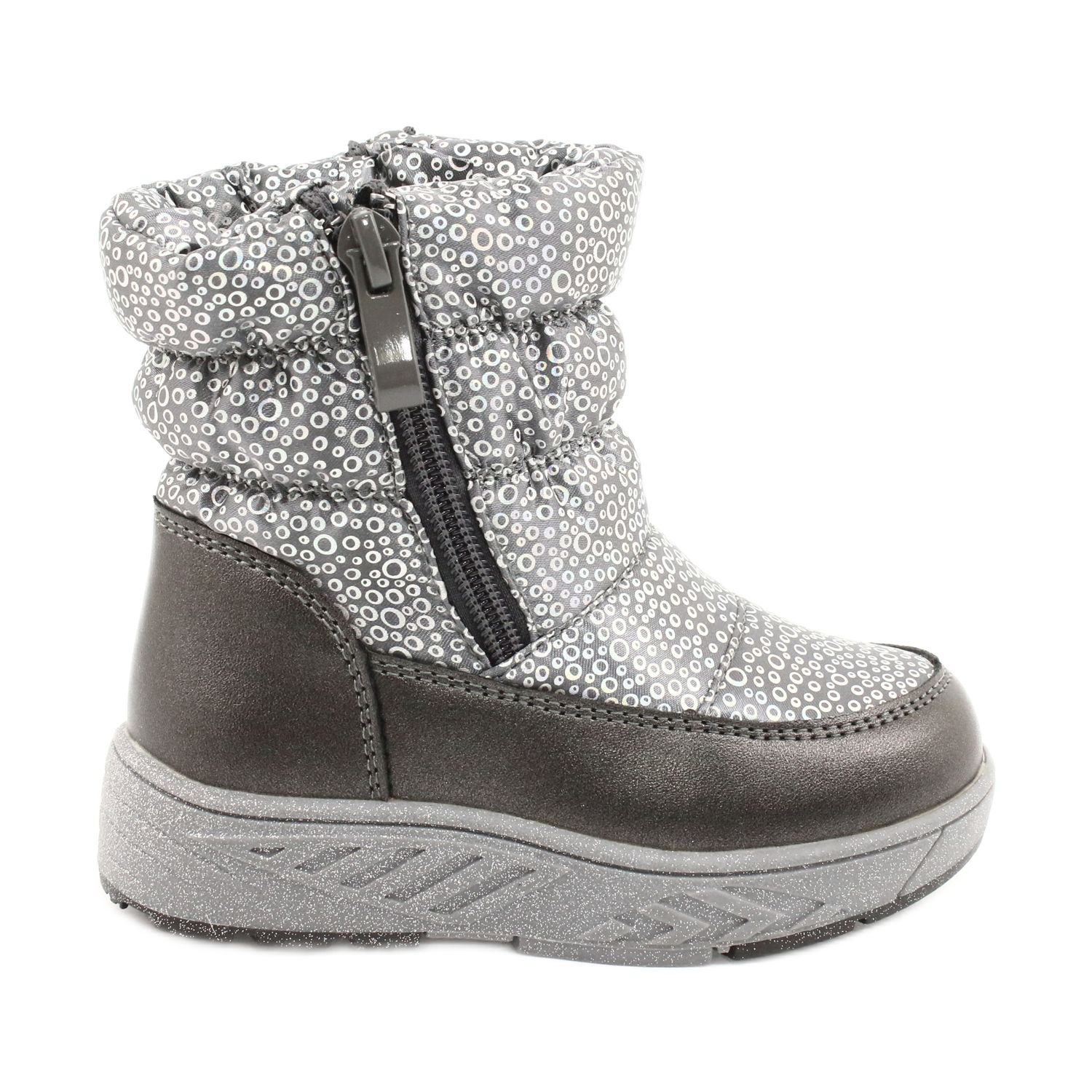 Realizzati in pelle ecologica di alta qualità e materiale in nylon, gli stivali sono disponibili nei bellissimi colori argento e grigio, decorati con accattivanti motivi olografici a forma di cerchi. Grazie alla copertura cucita sulla cerniera interna ed esterna, possiamo regolare liberamente la larghezza delle scarpe, il che non solo aumenta il comfort, ma impedisce anche efficacemente l'ingresso di neve.