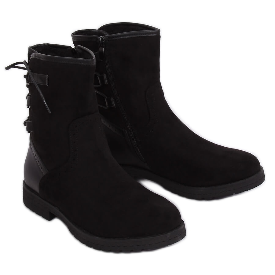 Gli stivali hanno il tacco piatto, alto 3 cm, che garantisce comodità durante le attività quotidiane. L'originale allacciatura sul retro della tomaia aggiunge carattere, e la pratica cerniera laterale permette una calzata facile e veloce. L'interno delle scarpe è foderato in calda pelle di pecora, che le rende perfette per le giornate più fredde.