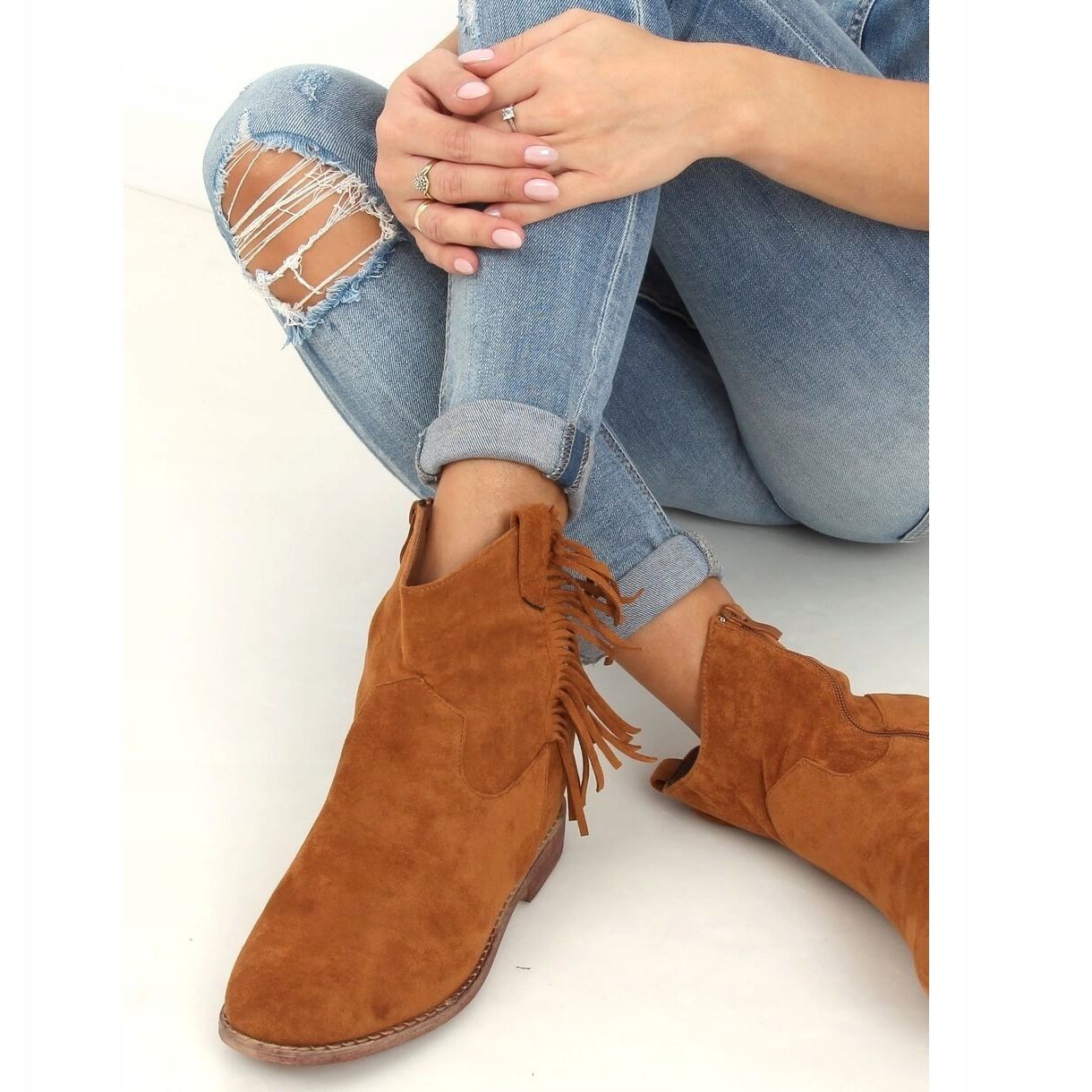 La tomaia di questi stivali è decorata con frange eleganti, che conferiscono loro un carattere boho unico. Grazie alla pratica cerniera sono estremamente comodi da indossare e da togliere. Realizzati in pelle scamosciata ecologica, gli stivaletti offrono non solo un look elegante, ma anche rispettoso dell'ambiente.
