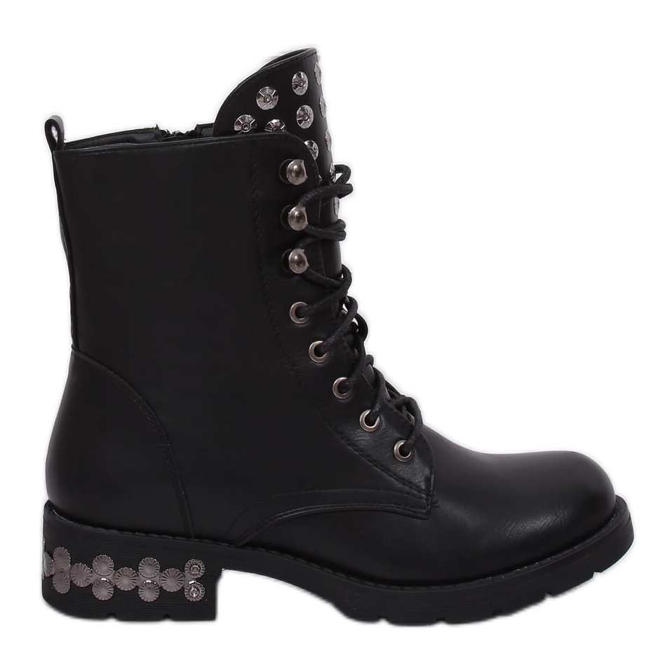 Il carattere unico del modello è enfatizzato dalla suola distintiva decorata con strass alla moda e dalla linguetta allacciata. Oltre alla tradizionale allacciatura, gli stivali sono dotati di una pratica cerniera laterale, che li rende più facili da indossare e togliere. Realizzati in pelle ecologica, sono caratterizzati da alta qualità e durata. La fodera in schiuma garantisce comfort per tutto il giorno.