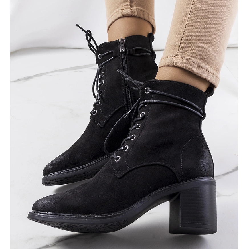 Stivali sanlow eleganti e casual in nero realizzati in pelle scamosciata. Modello su un post stabile (6,5 cm) con un'altezza totale di 19,5 cm (caviglia), con un naso quadrato, un castello laterale e un legame decorativo sulla caviglia. Leggermente isolato con una "coperta di calzature", perfetta per la stagione autunnale/inverno.
