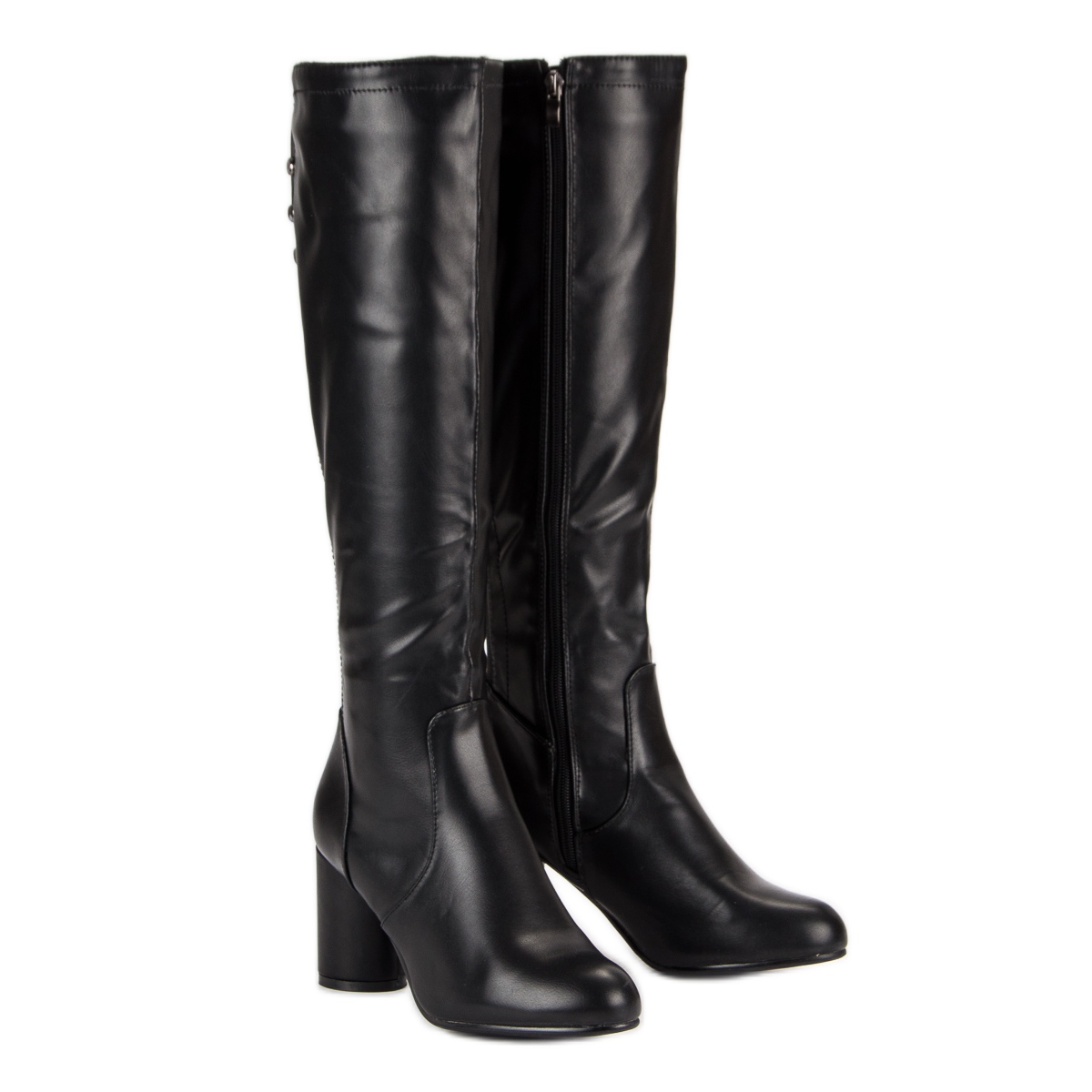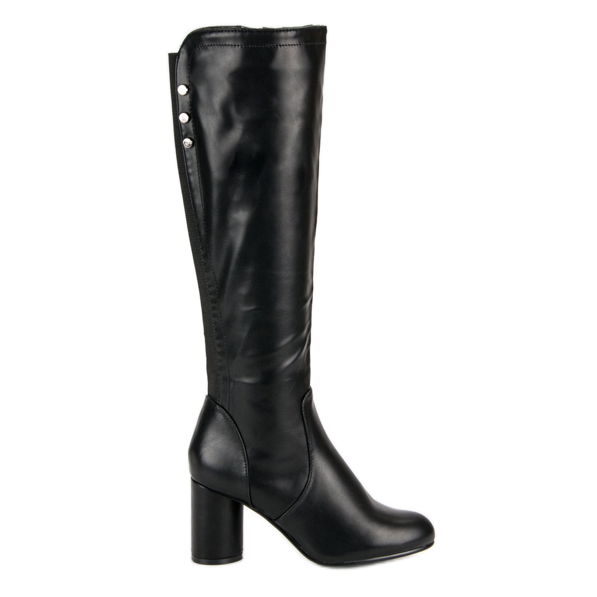 Gli stivali neri a tacco alto sono una scelta perfetta anche per le giornate più fredde, perché il loro design classico si abbina perfettamente a cappotti e maglioni caldi. L'elastico decorativo e i discreti strass sul retro conferiscono loro un carattere unico, rendendoli ancora più attraenti.