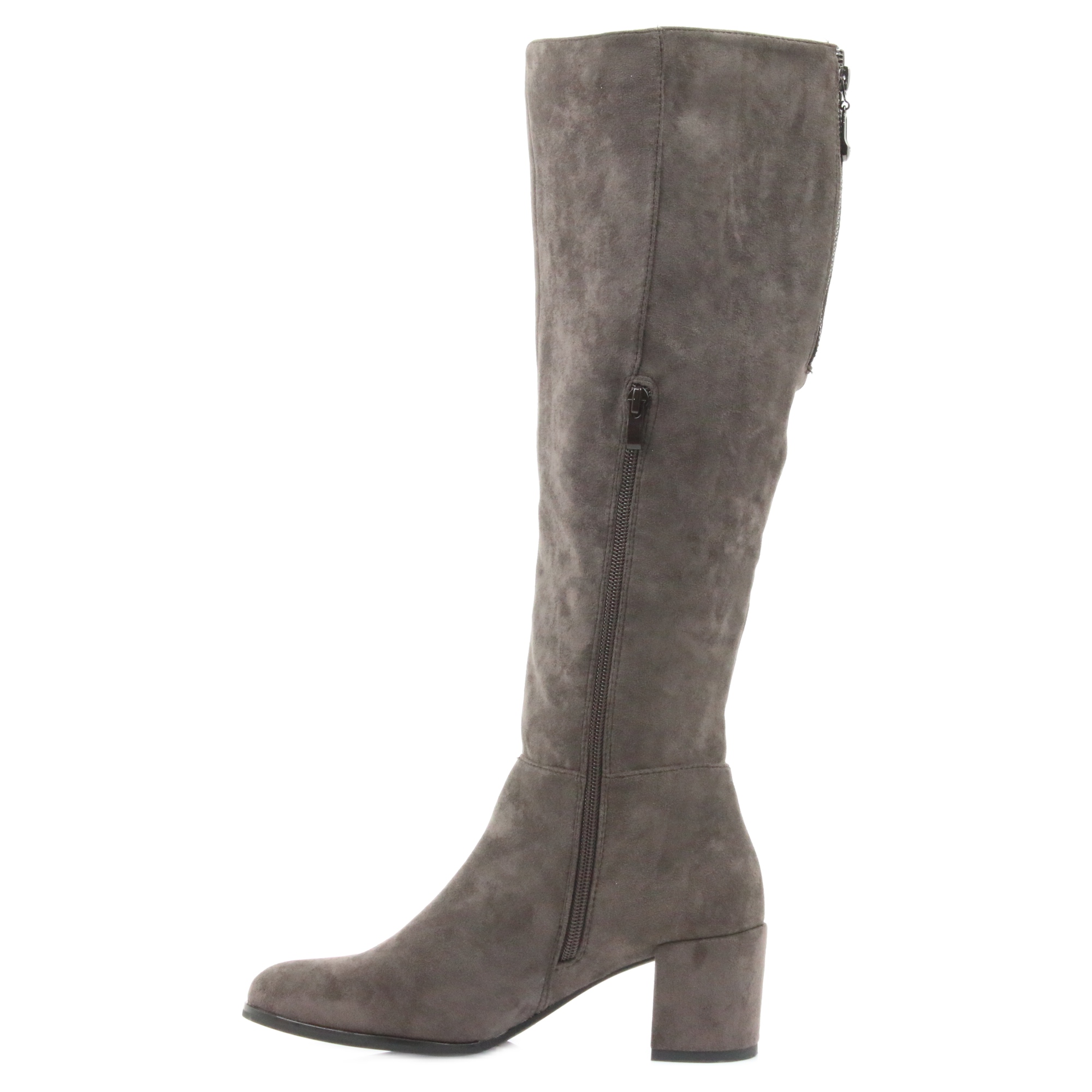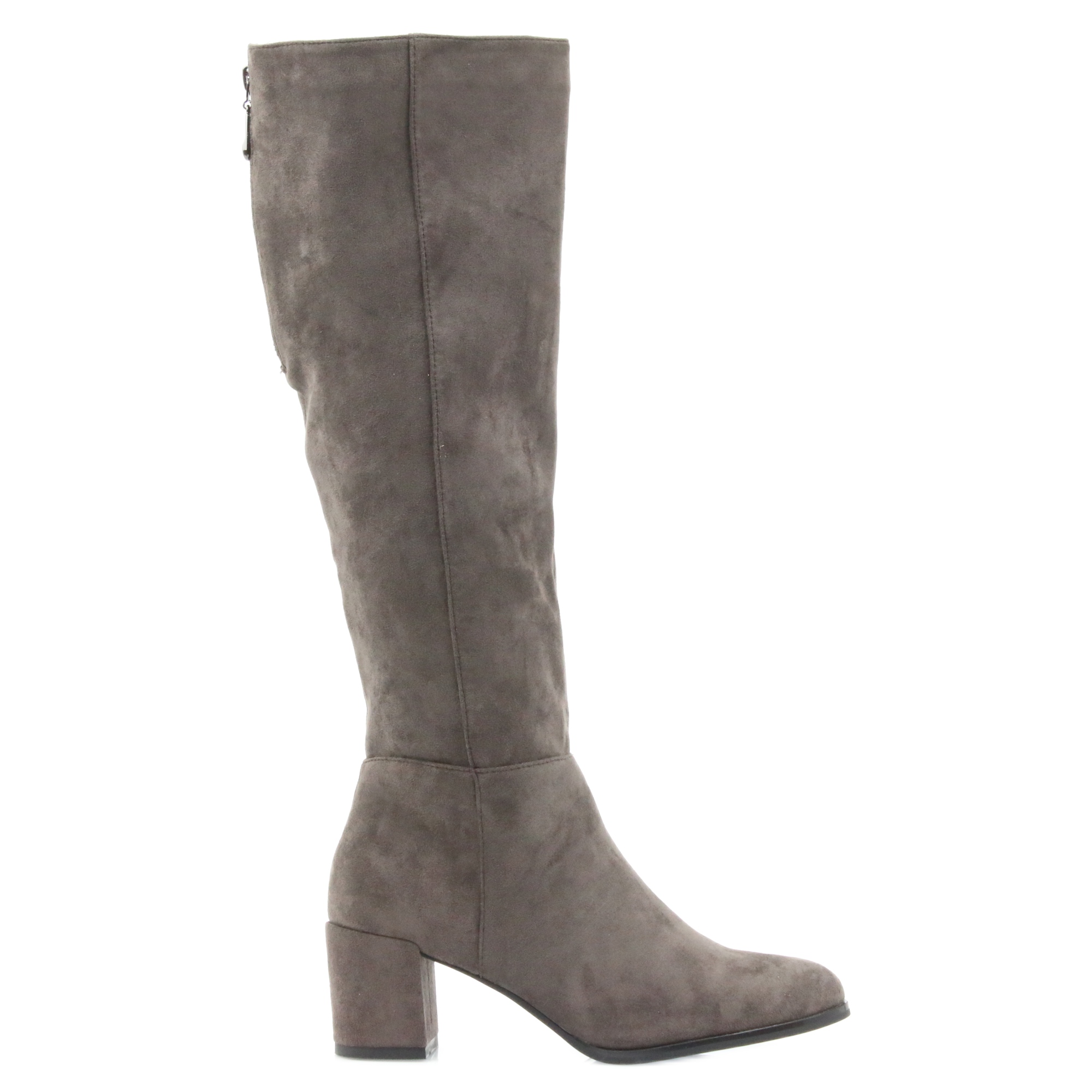 La tomaia alta, che arriva fino al ginocchio, e il taglio classico rendono queste scarpe perfette per diversi stili, dal formale al casual. Il tacco basso, alto 6 cm, garantisce stabilità e comodità se indossate per lunghe ore. Un ulteriore vantaggio è la pratica cerniera nella parte superiore della tomaia, che permette di indossare e togliere facilmente le scarpe e ne aumenta anche la larghezza.
