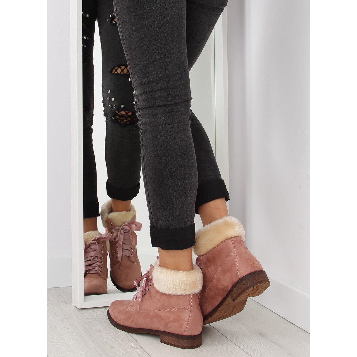 Le scarpe hanno il tacco piatto, alto 3 cm, che le rende estremamente comode e stabili. La punta tonda sottolinea il loro carattere femminile, e la chiusura con lacci permette una perfetta aderenza al piede. Inoltre, la loro altezza alla caviglia permette loro di proteggere perfettamente i piedi dal freddo.
