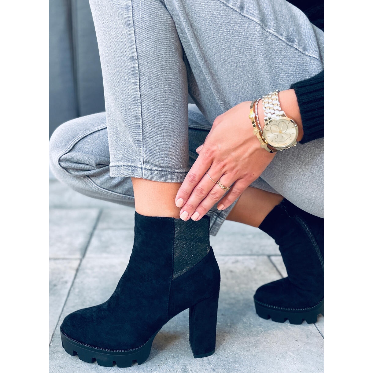 Gli stivaletti Ase Black hanno un tacco alto 10,5 cm e un plateau di 3 cm, che fa sembrare le tue gambe incredibilmente snelle e sensuali. Grazie alla pratica cerniera, indossarli è puro piacere, e la comoda fodera in schiuma si prenderà cura dei tuoi piedi tutto il giorno.