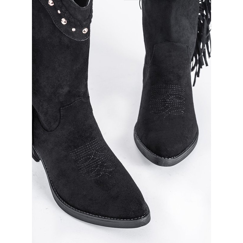 Scopri l'ultimo successo della stagione: stivali da cowboy alti neri con strass Clover! Queste scarpe estremamente eleganti sono una combinazione di eleganza e disinvoltura, che si adatta perfettamente alle tendenze primaverili e autunnali. Decorati con frange e spettacolari strass dorati, attirano l'attenzione e sottolineano lo stile individuale di ogni donna.