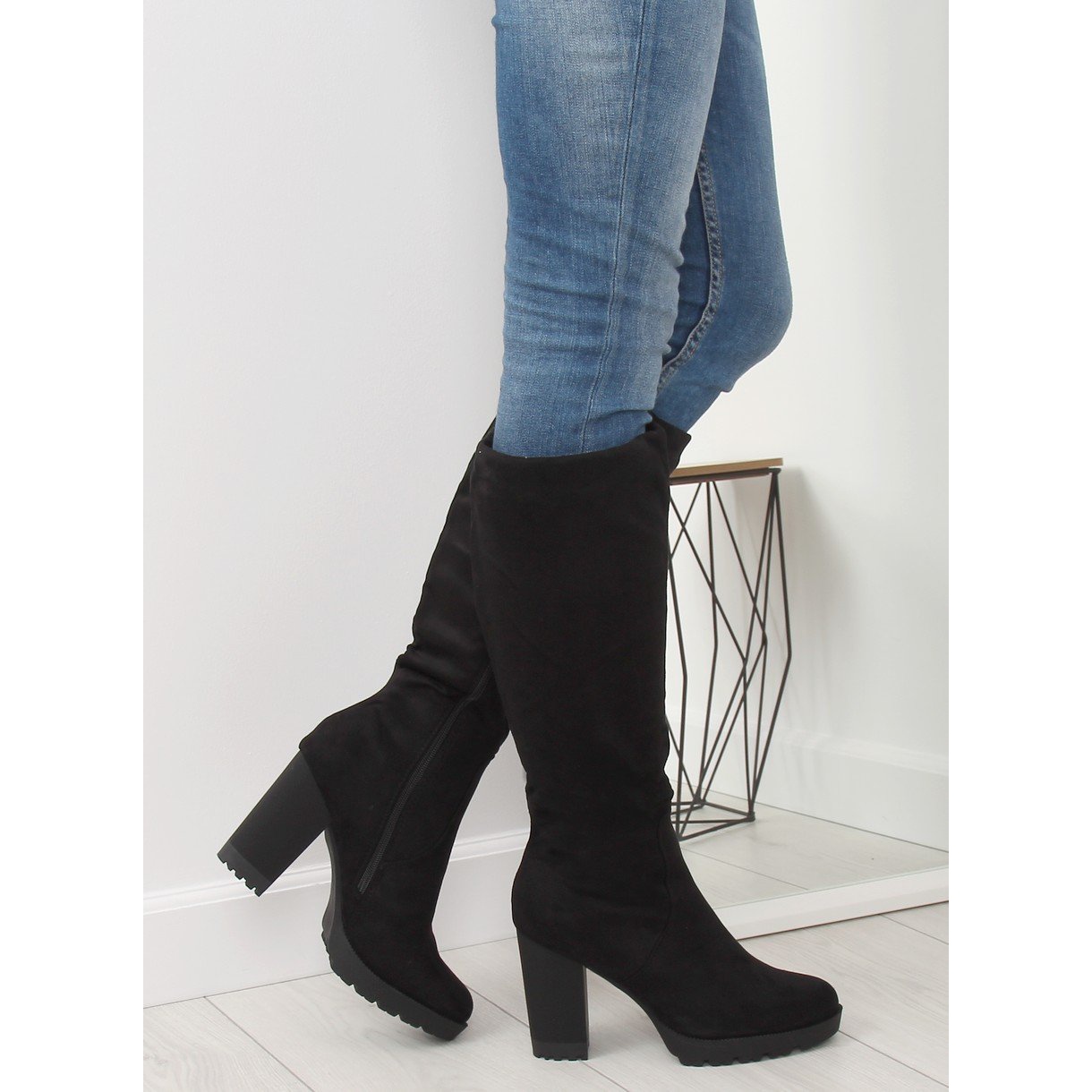 Gli stivali sono realizzati in pelle scamosciata ecologica di alta qualità, che ne sottolinea l'aspetto elegante. La loro tomaia, lunga fino al ginocchio, è dotata di una pratica cerniera che li rende facili da indossare e togliere. L'interno degli stivali è rivestito in delicata pelliccia, garantendo comfort e calore anche nelle giornate più fredde.