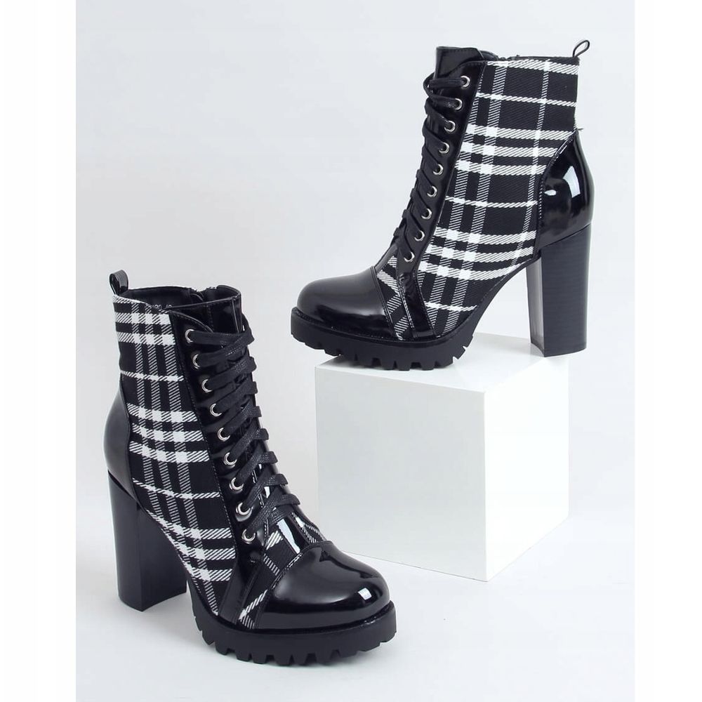 Il loro aspetto unico è dovuto al motivo a quadretti alla moda e agli inserti laccati che attirano l'attenzione e conferiscono originalità alle scarpe. Grazie all'allacciatura tradizionale e alla pratica cerniera laterale della tomaia, indossare e togliere questi stivali è un puro piacere. L'interno delle scarpe è rivestito in delicata pelliccia, che garantisce calore e comfort per tutto il giorno.