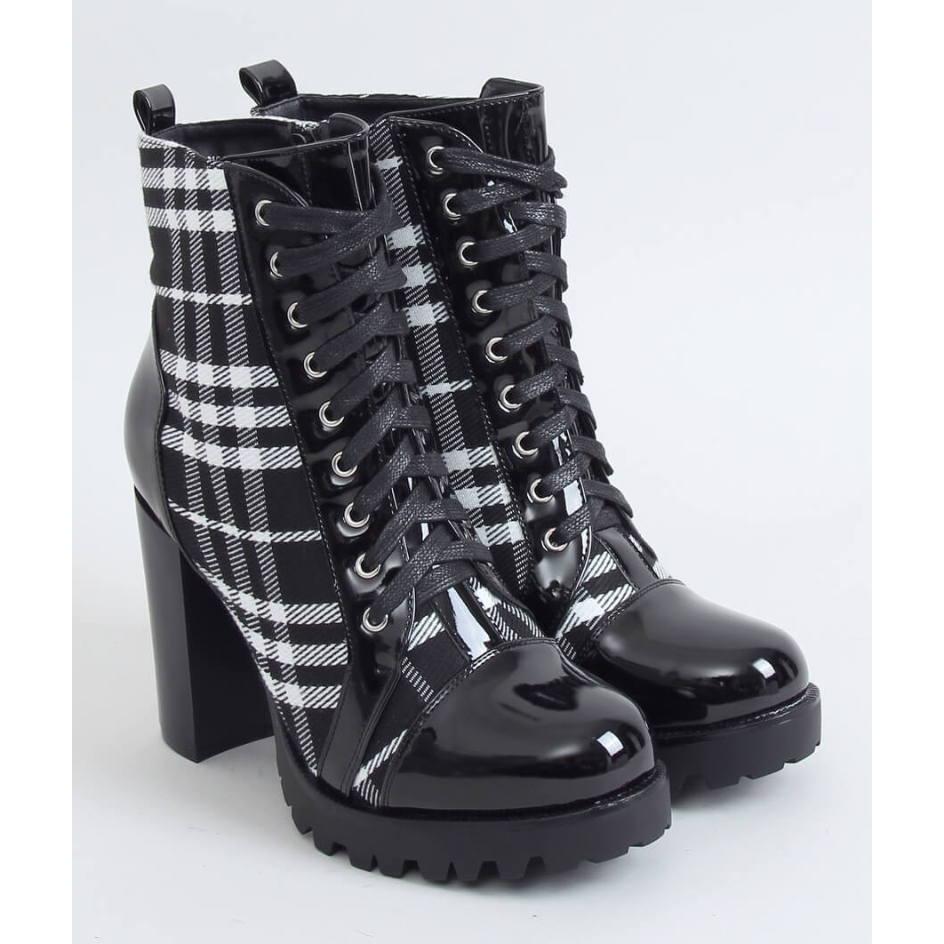 Scopri gli esclusivi stivali con tacco alto NS080P in nero che aggiungeranno chic ed eleganza a qualsiasi tuo stile. Questi splendidi stivaletti da donna si distinguono non solo per il loro motivo a quadri alla moda, ma anche per gli inserti in vernice che conferiscono loro un carattere unico. L'altezza del tacco è di 9,5 cm e il plateau è di 2 cm, il che garantisce una vestibilità comoda e allunga otticamente le gambe.