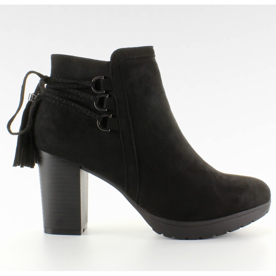 Stivaletti alla moda realizzati in pelle scamosciata ecologica, che combinano comfort con una finitura alla moda. Hanno un naso rotondo e un palo ampio e stabile con un'altezza di 8,5 cm, che garantisce comfort per tutto il giorno. L'allacciatura decorativa e le sottili frange sul retro conferiscono carattere alle scarpe. All'interno è presente una cerniera per indossarlo facilmente.