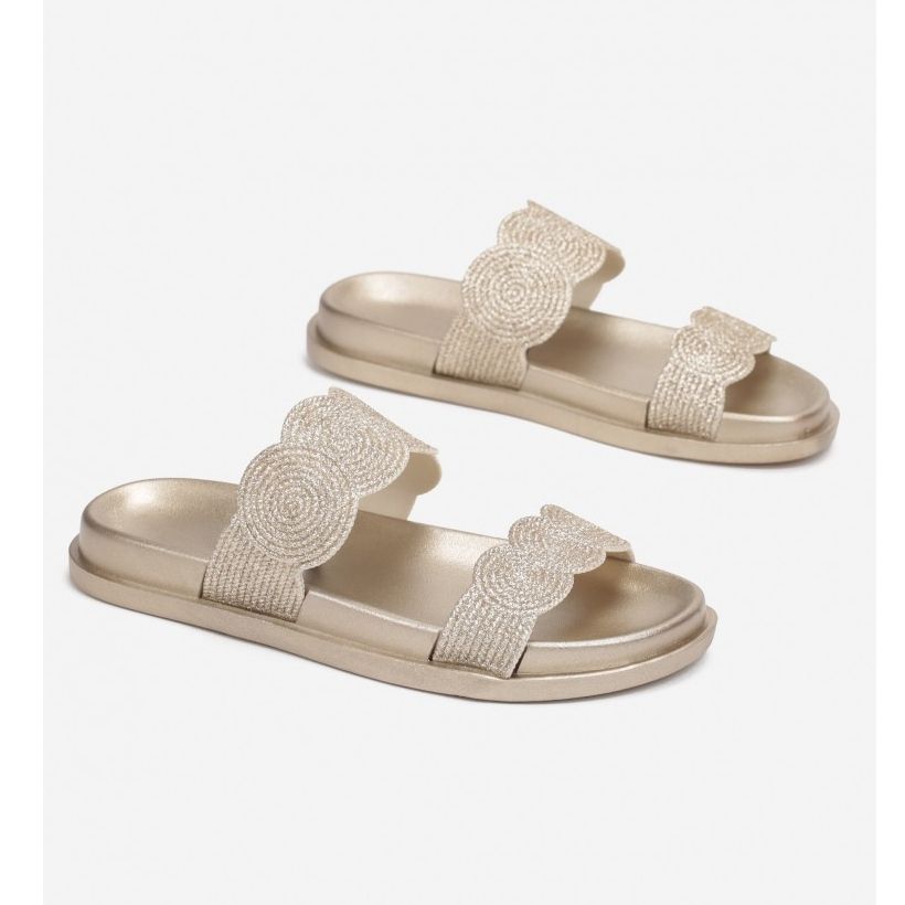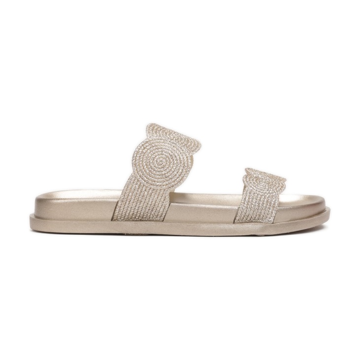 Ti presentiamo le ciabatte slip-on Vices GJ-3-60-oro, che uniscono il comfort allo stile alla moda! Queste esclusive infradito, in un elegante colore oro, attirano l'attenzione con la loro forma originale e le impressionanti strisce ondulate decorate con glitter. Grazie alla punta e al mesopiede esposti, i tuoi piedi possono respirare e ti sentirai a tuo agio tutto il giorno.