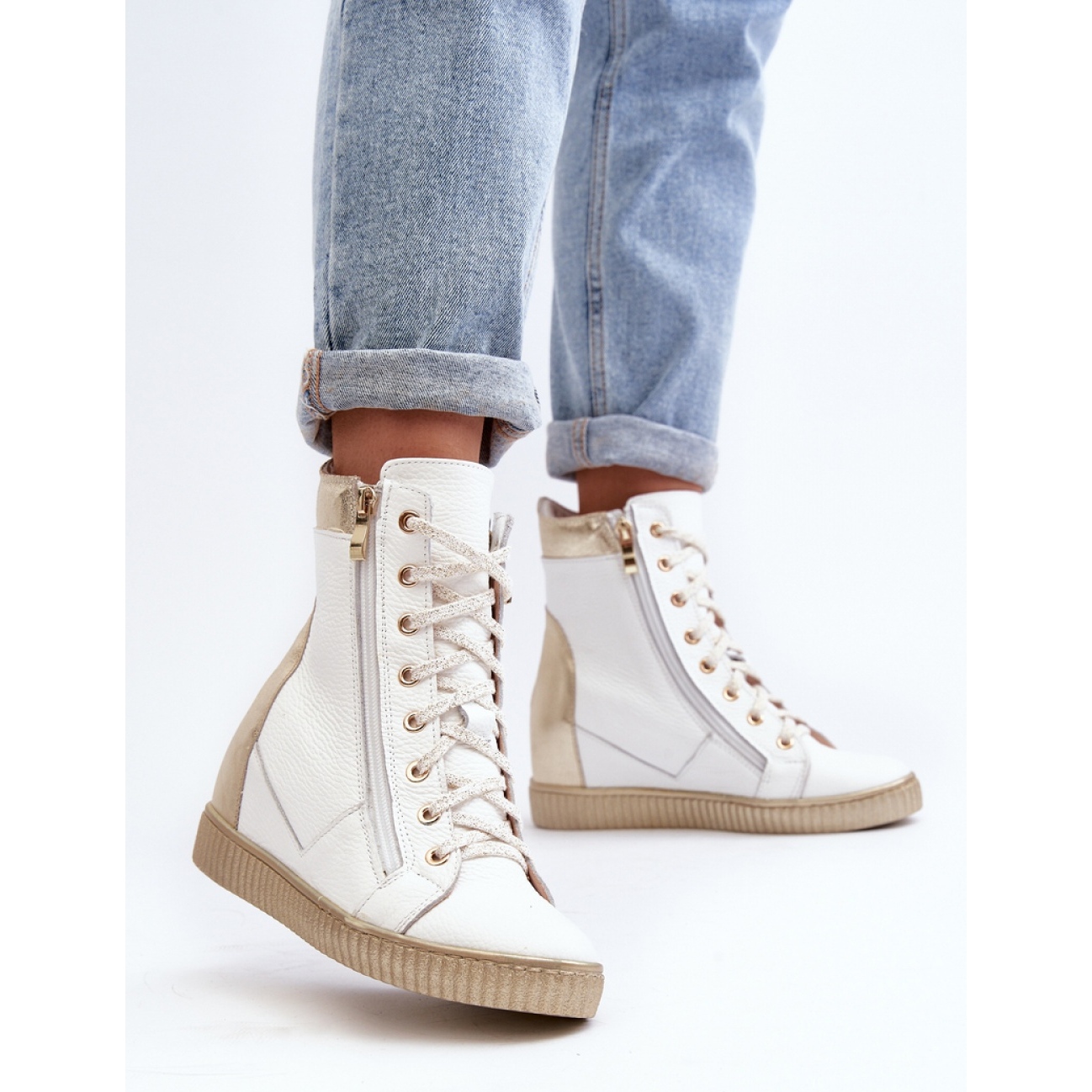 Le sneaker a cuneo bianco Zazoo sono la combinazione perfetta di stile e comfort che ogni donna dovrebbe avere nella sua collezione! Realizzati in pelle naturale di alta qualità, queste scarpe da ginnastica bianche si distinguono per un design elegante e moderno. Situato su un cuneo nascosto con un'altezza di 7,5 cm, forniscono un'ulteriore altezza mantenendo il comfort di indossare.